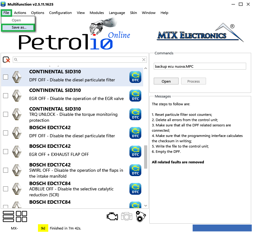 By clicking on the File menu at the top and then on Save As... you will be able to save the file including all the changes made (e.g. DPF OFF, EGR OFF, DTC OFF, etc...)